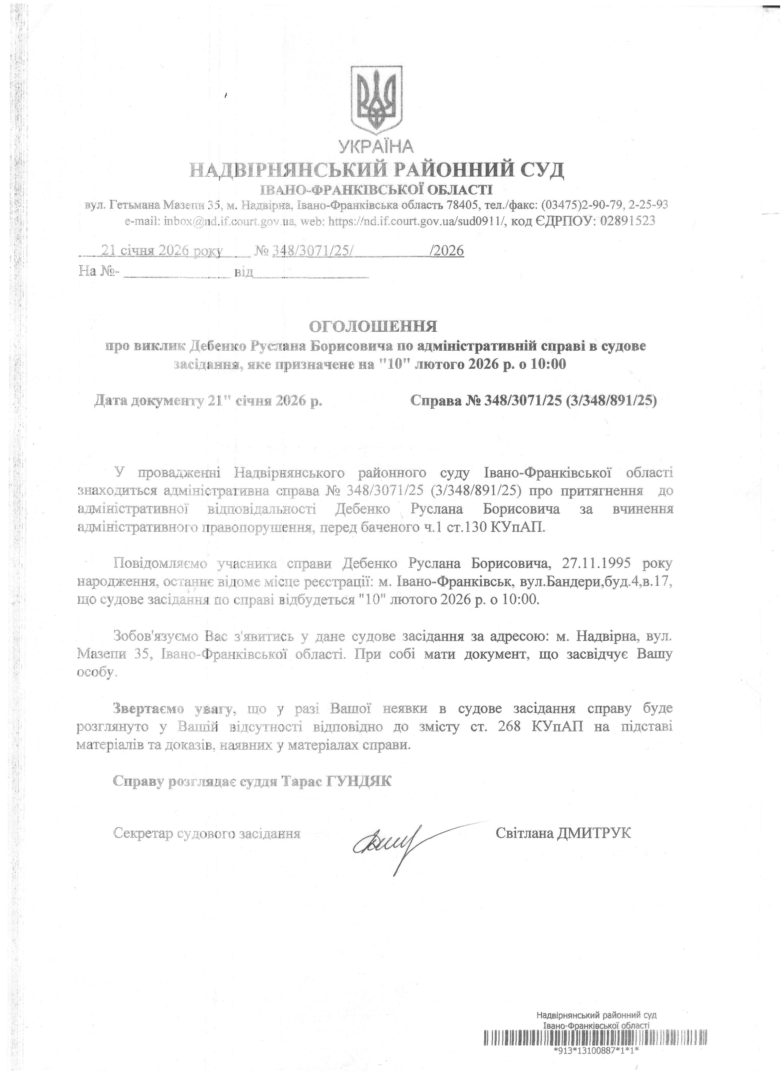 Оголошення про виклик до суду Дебенко Руслана Борисовича