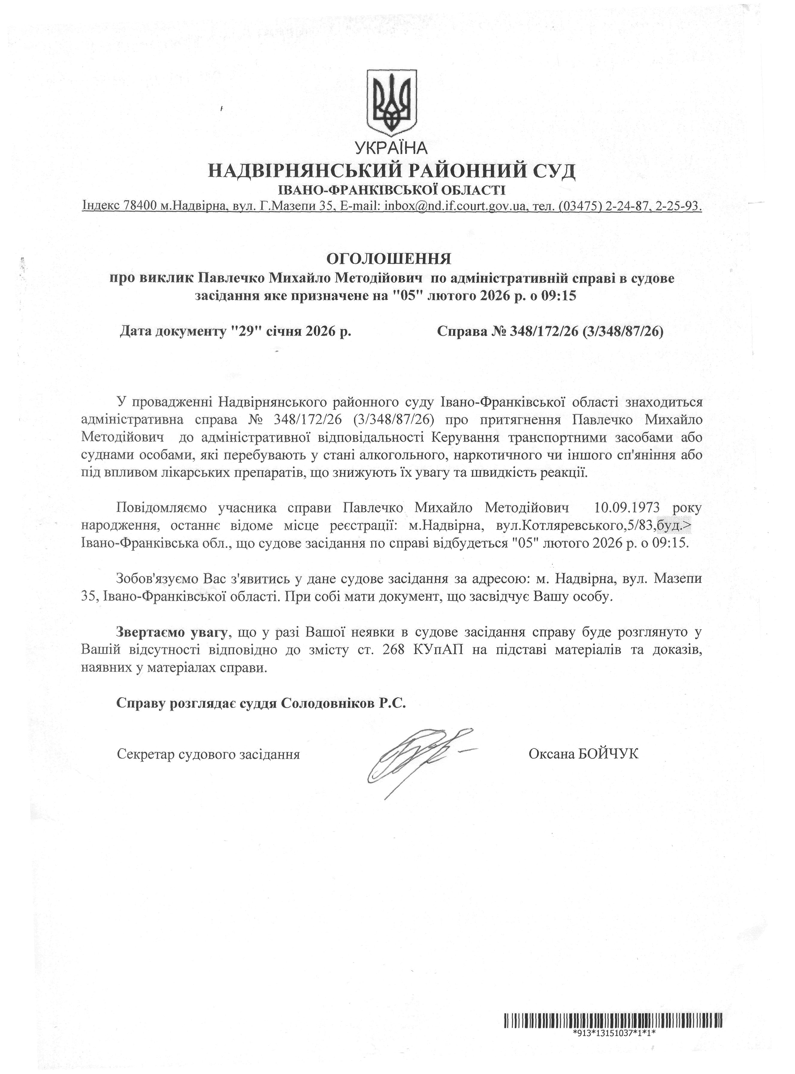 Оголошення про виклик до суду Павлечко Михайло Методійович