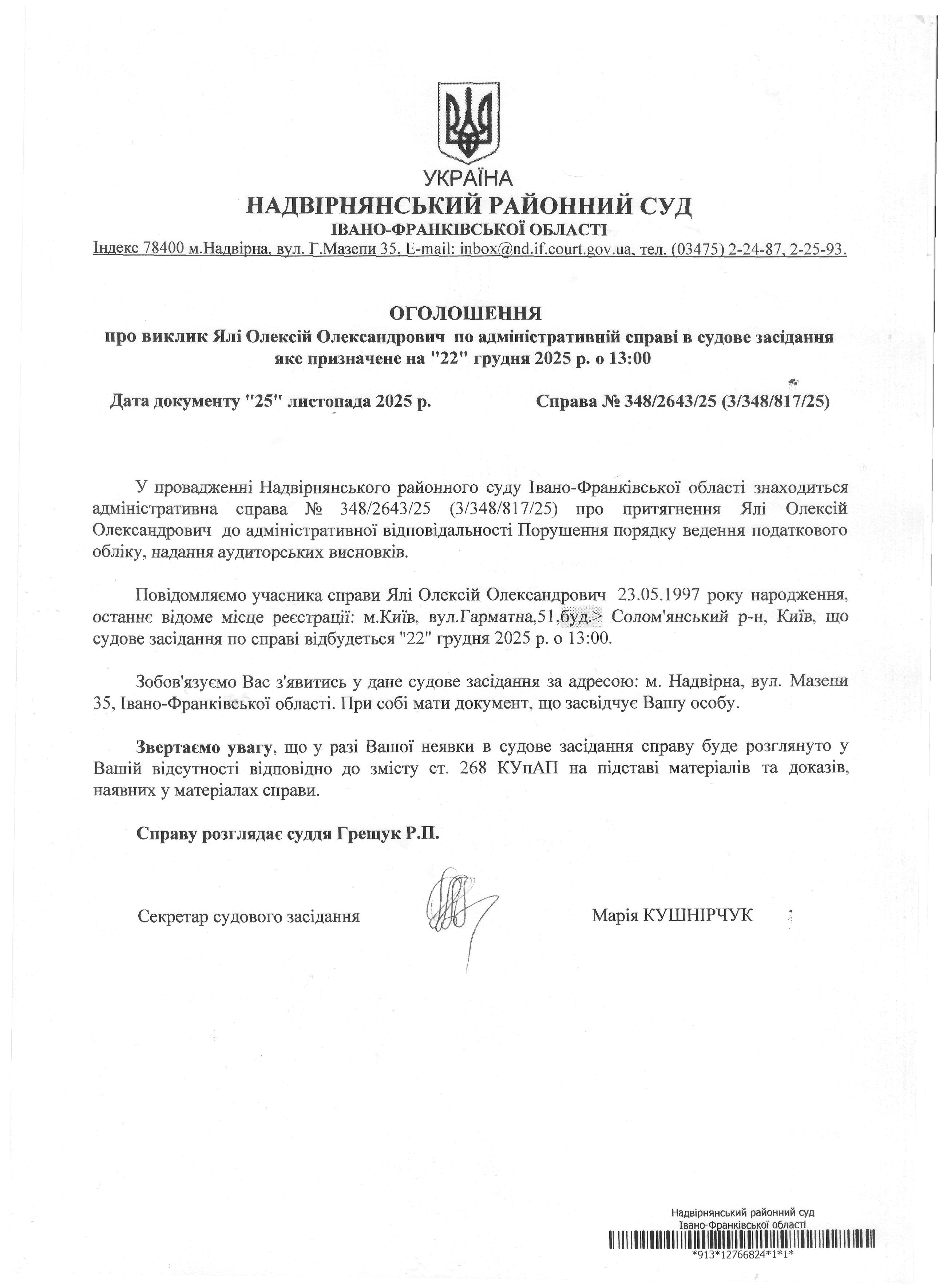 Оголошення про виклик до суду Ялі Олексія Олександровича