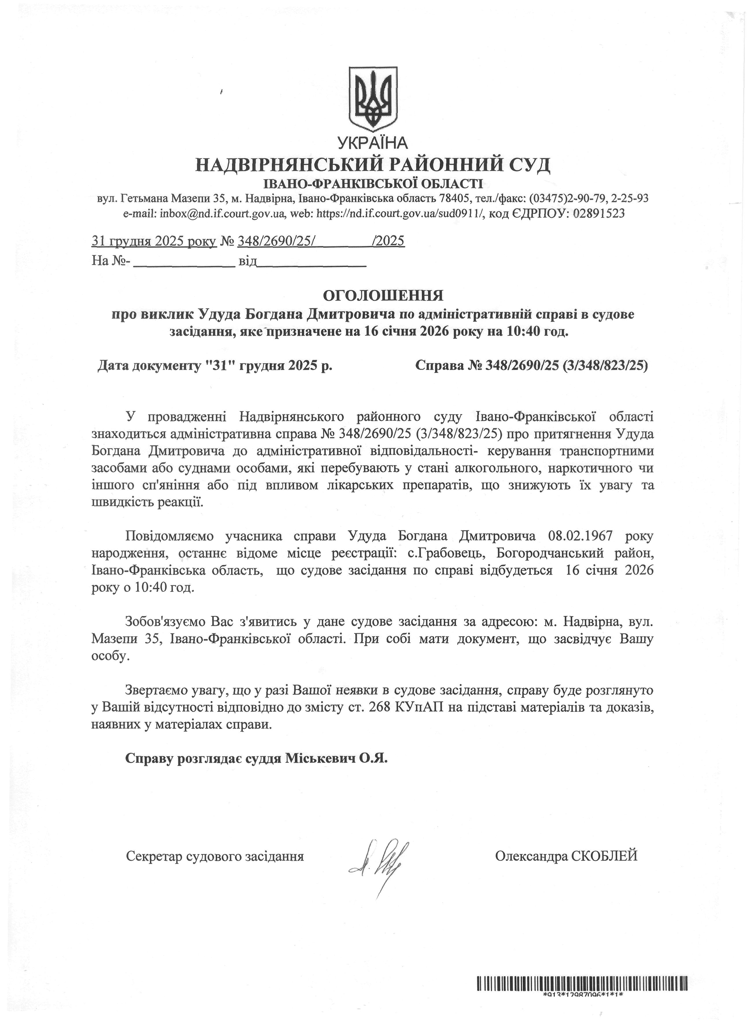 Оголошення про виклик до суду Удуда Богдана Дмитровича