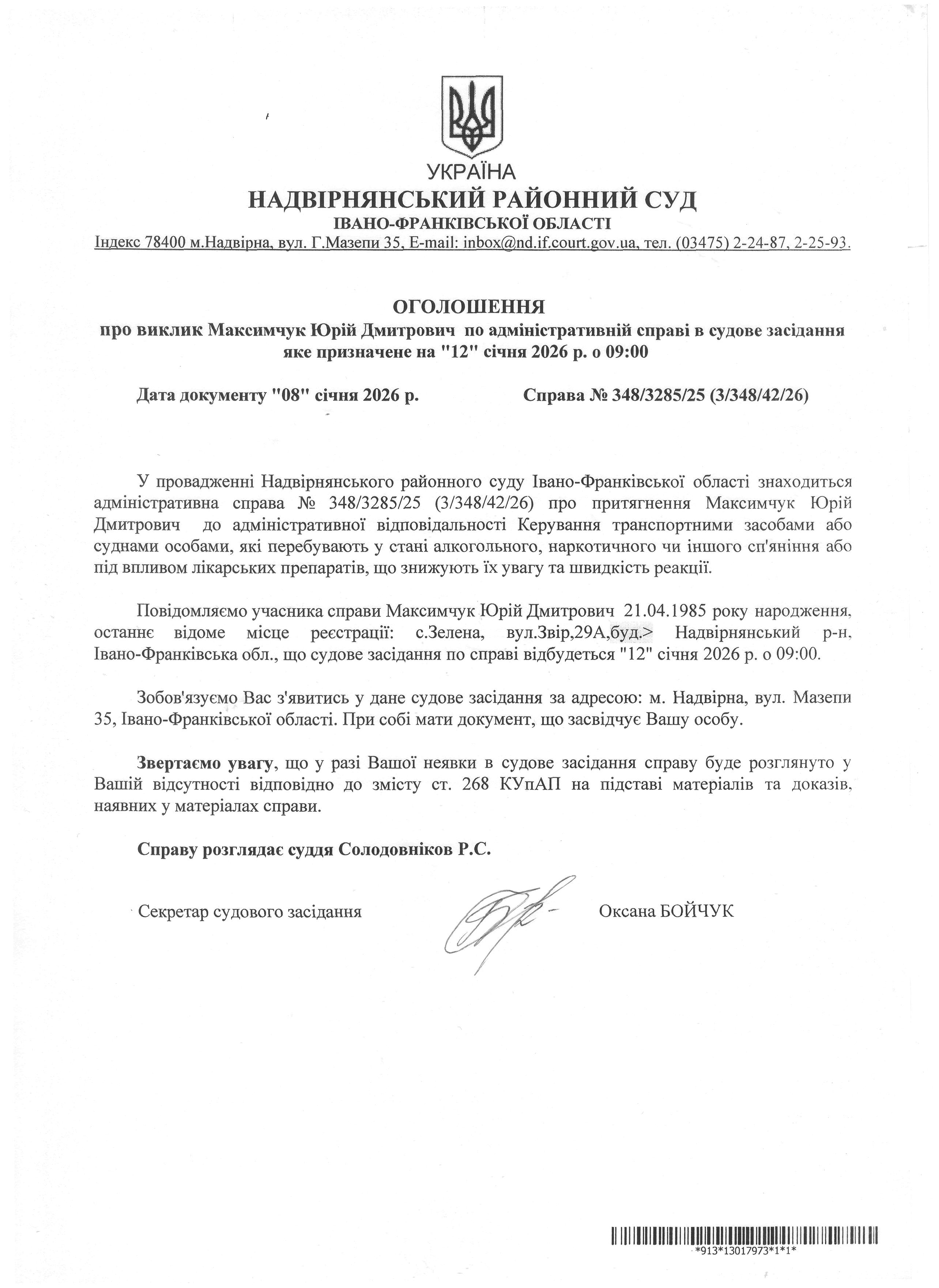 Оголошення про виклик до суду Максимчук Юрій Дмитрович