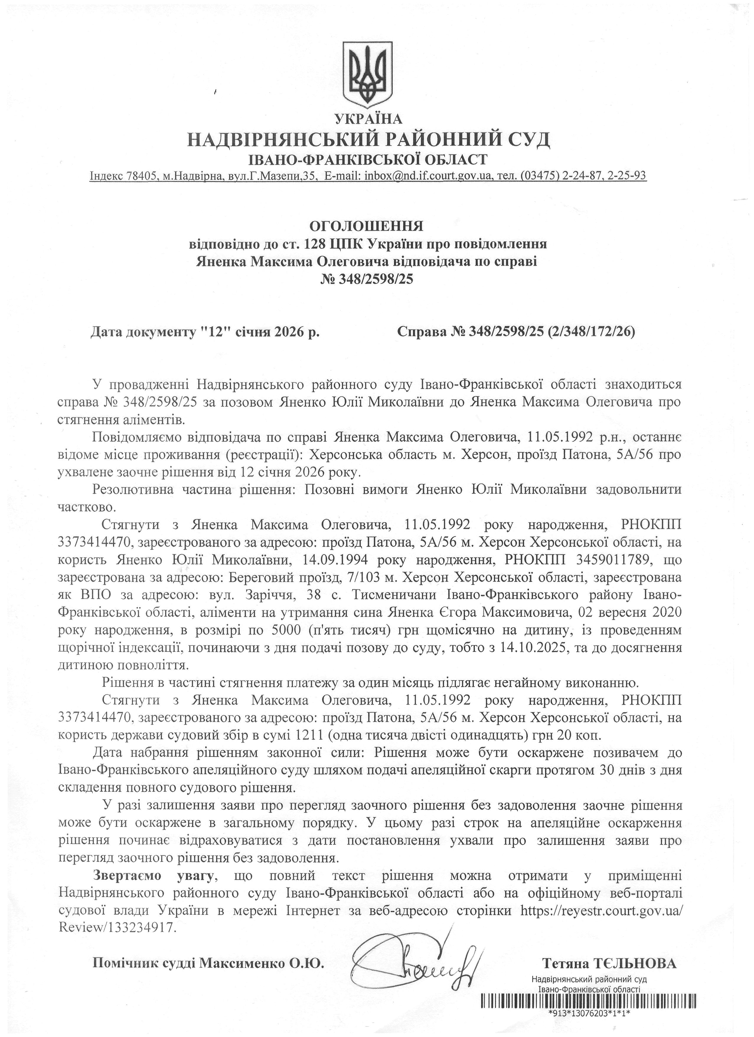 Оголошення про виклик до суду Яненка Максима Олеговича