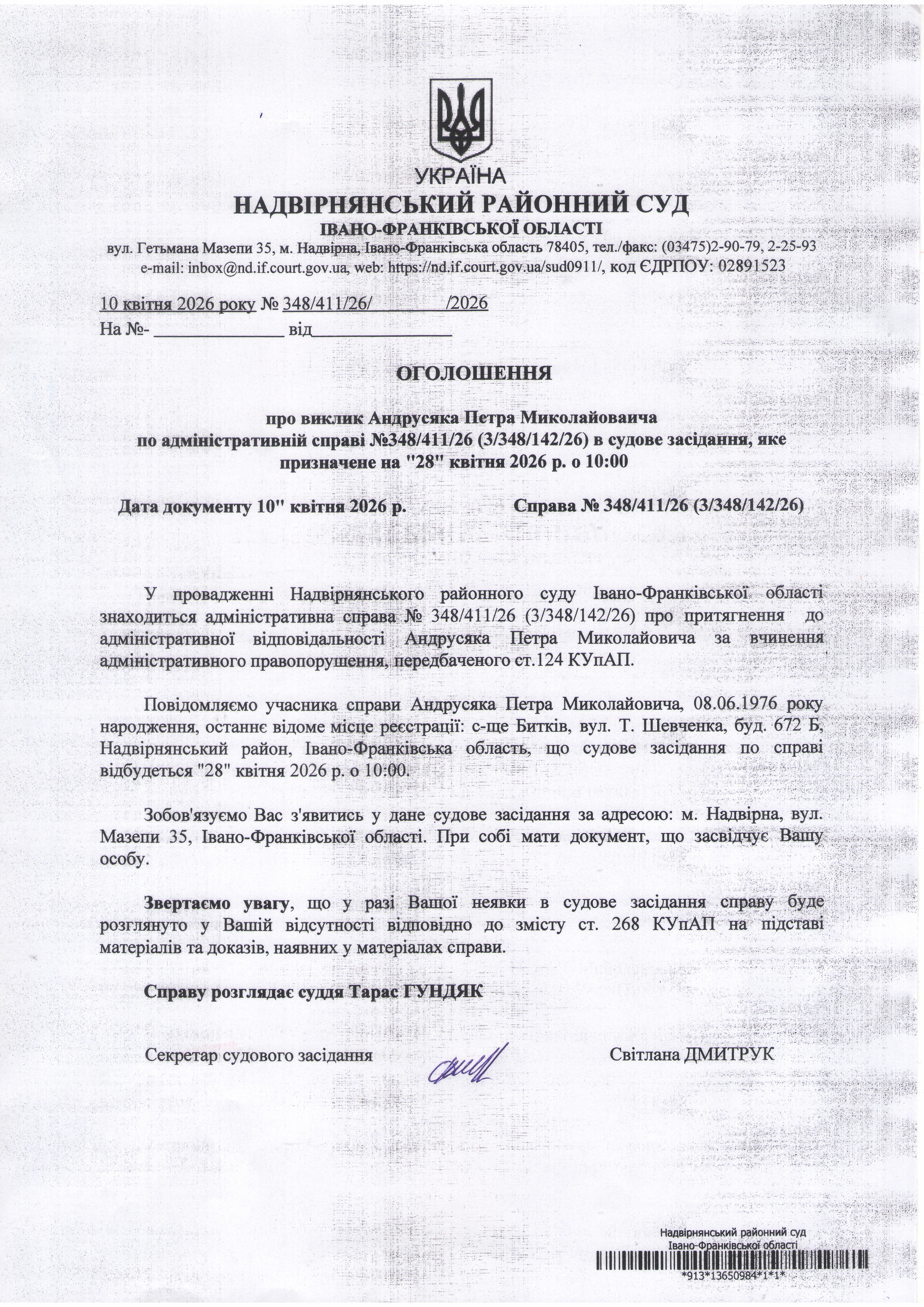 Оголошення про виклик до суду Андрусяка Петра Миколайовича