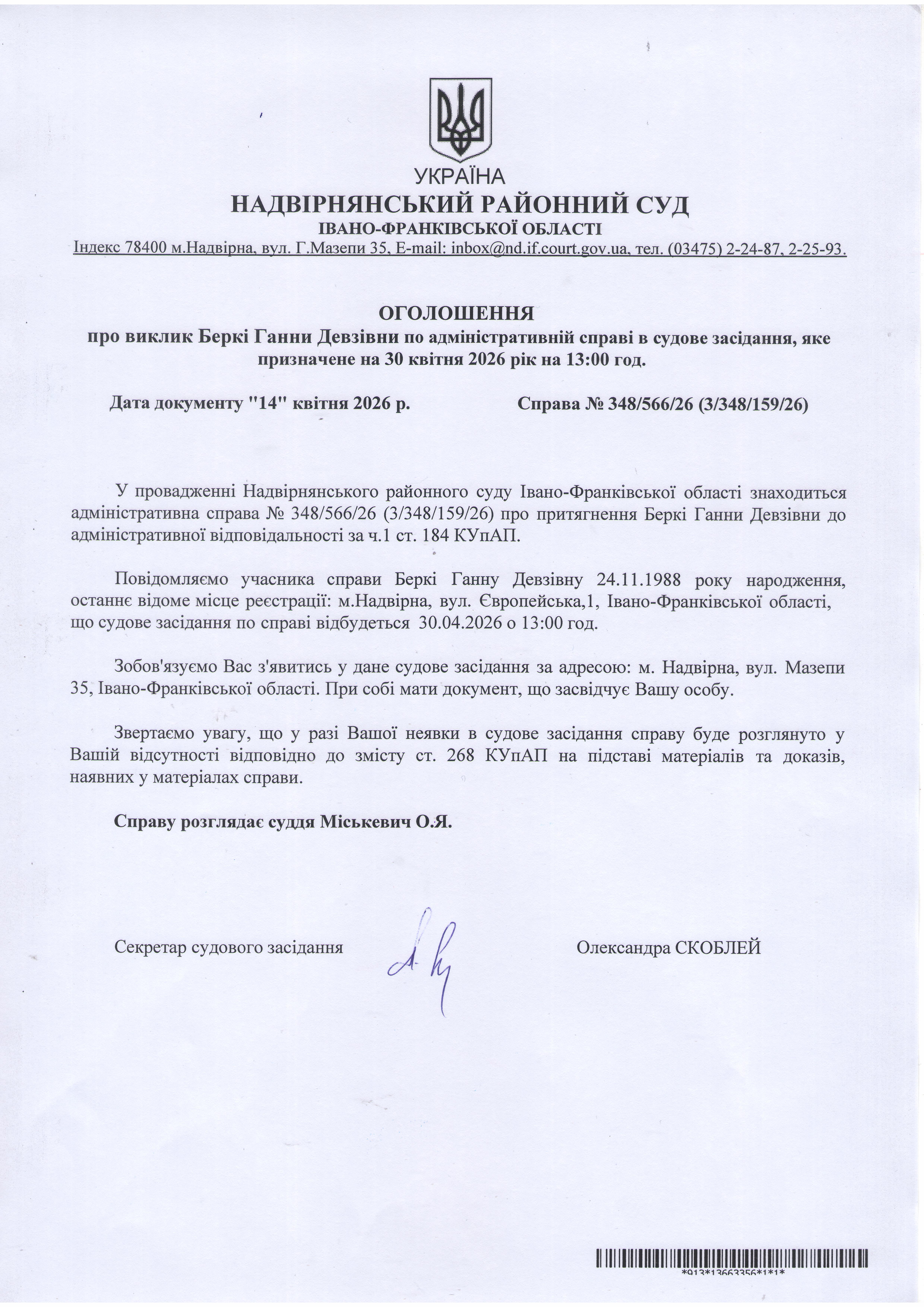 Оголошення про виклик до суду Беркі Ганни Девзівни